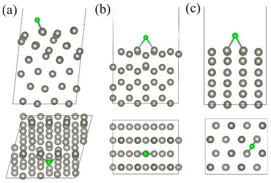Spin-polarized simulations were conducted based on the DFT using the Vienna Ab Initio Simulation Package (VASP) [34]. The projector augmented plane–wave method [35] was used to treat the ion–electron interactions. An energy cut-off of 540 eV was adopted for the plane–wave expansion of the electronic wave functions. The exchange correlation functional based on the general gradient approximation of Perdew–Burke–Ernzerh [36] was used in conjunction with Grimme’s DFT-D3 method [37] to accurately describe the dispersion correction of long-range van der Waals interactions between atoms and surfaces. All considered structures were fully optimized until the maximum force acting on each atom was less than 0.02 eV/Å. The change in the total energy was less than 104 eV in the case of structure optimization and less than 108 eV in the case of electronic self-consistent simulations. The Brillouin zone was sampled with a 4 × 4 × 1 and 8 × 8 × 1 centered k-mesh grid for the bulk Zn and for the surfaces of Zn, respectively. The functional and k-point sampling choice was based on previous work [7].