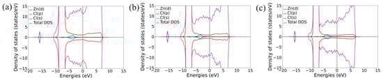 PDOS diagrams of a Cl atom after adsorption on the Zn(111), Zn(110), and Zn(100) surfaces is shown in Figure 4a–c. Energy level-splitting of Cl-p orbitals produced by the spin–orbit interaction is visible in Figure 4a,c. In the case of Cl adsorbed on the Zn(111) surface (Figure 4a), the S-p orbital is splitting and broadening because of a strong coupling to the Zn-d orbital. For the Cl atom adsorbed on the Zn(110) surface (Figure 4b), there is no spin decomposition, while the Cl-p orbital is significantly broadened, which can be due to Cl atoms having the highest Eads on the Zn(110) surface compared to the other surfaces considered. In the case of the Cl atom on the Zn (100) surfaces (Figure 4c), a decomposition and significant broadening of the Cl-p orbital is observed, indicating a strong hybridization between the Cl-p and the Zn-d orbitals. PDOS graphs for the O atom adsorbed on the Zn(111), Zn(110), and Zn(100) surfaces is shown in Figure S5a–c. A strong degeneracy of the O-p orbital of the O atom due to the spin–orbit interaction with the Zn-d orbital of the surface Zn atoms can be seen in the case of the Zn(111) (Figure S5a), Zn(110) (Figure S5b), and Zn(100) (Figure S5c) surfaces. Figure S6a–c present PDOS diagrams of the S atom adsorbed on the Zn(111), Zn(110), and Zn(100) surfaces, respectively. Energy level-splitting for the S-p orbital produced by the spin–orbit interaction is visible in Figure S6. In the case of S adsorbed on the Zn(111) surface (Figure S6a), the S-p orbital is split and broadened because of a strong coupling to the Zn-d orbital. For S adsorbed on the Zn(110) (Figure S6b) and Zn(100) (Figure S6c) surfaces, the S-p orbital is broadened, signifying coupling to the Zn-d orbital, while no spin decomposition is found. The PDOS plots can be useful for predicting the broadening of inner molecular orbitals of adsorbed atoms (molecules, etc.); thus, they can facilitate the prediction of selectivity and corrosion resistance of metal surfaces [26,27].