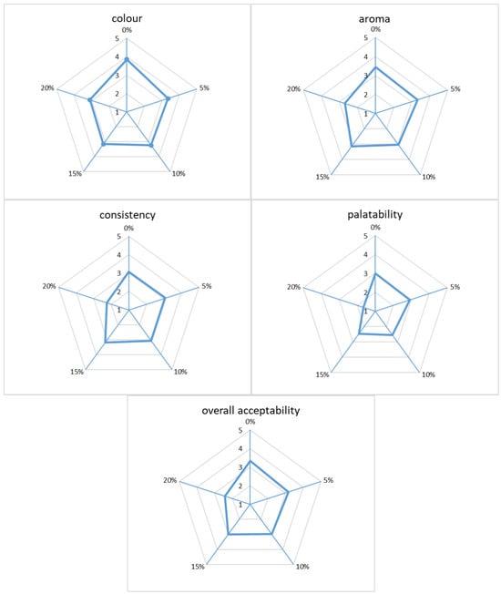 The results of the sensory evaluation are presented in Figure 2. Consumers rated the control gluten-free bread without the addition of chaga mushroom as the tastiest and most aromatic. The higher the addition of chaga mushroom, the lower the score for the individual parameters tested was obtained by the panellists. Consumers chose bread with 20% chaga mushroom as the least tasty (giving it a value of 1.65); this bread was also rated the worst in terms of consistency (2.25) and smell (2.71). Also, in terms of colour, the worst, according to consumers, was bread fortified with 20% chaga mushroom (3.11).