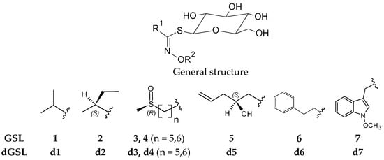 - Blažević, I.; Montaut, S.; Burčul, F.; Olsen, C.E.; Burow, M.; Rollin, P.; Agerbirk, N. Glucosinolate structural diversity, identification, chemical synthesis and metabolism in plants. Phytochemistry 2020, 169, e112100. [Google Scholar] [CrossRef]