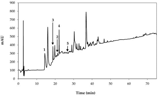 HLPC chromatogram of the ethanolic seed extract of Lunaria annua L. Detection at 220 nm. Legend: 1-methylethyl GSL (glucoputranjivin) (1), (1S)-1-methylpropyl GSL (glucocochlearin) (hypothesis) (2), (Rs)-5-(methylsulfinyl)pentyl GSL (glucoalyssin) (3), (Rs)-6-(methylsulfinyl)hexyl GSL (glucohesperin) (4), (2S)-2-hydroxy-4-pentenyl GSL (gluconapoleiferin) (hypothesis) (5).