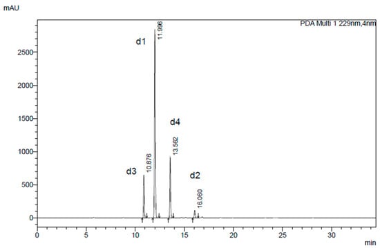 HLPC-PDA chromatogram of dGSLs obtained from the ethanolic seed extract of Lunaria annua L (Laboratory A). Detection at 229 nm. Legend: 1-methylethyl dGSL (d-glucoputranjivin) (d1), (1S)-1-methylpropyl dGSL (d-glucocochlearin) (d2), (Rs)-5-(methylsulfinyl)pentyl dGSL (d-glucoalyssin) (d3), (Rs)-6-(methylsulfinyl)hexyl dGSL (d-glucohesperin) (d4).