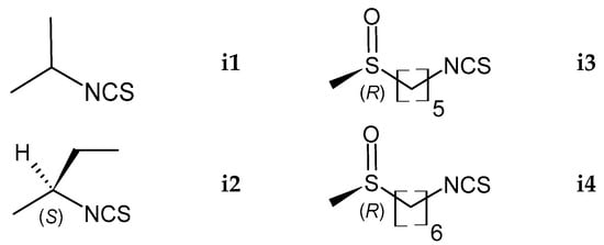 Structures of ITCs issued from enzymatic hydrolysis of GSLs and identified by GC-MS analysis. Legend: 1-methylethyl ITC (putranjivin) (i1), (1S)-1-methylpropyl ITC (i2), (Rs)-5-(methylsulfinyl)pentyl ITC (R-alyssin) (i3), (Rs)-6-(methylsulfinyl)hexyl ITC (R-hesperin) (i4).