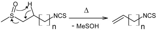 Proposed mechanistic scheme for the thermal decomposition of (Rs)-5-(methylsulfinyl)pentyl ITC (R-alyssin) (i3, n = 5) and (Rs)-6-(methylsulfinyl)hexyl ITC (R-hesperin) (i4, n = 6) to the corresponding 4-pentenyl ITC (brassicanapin, n = 5) and 5-hexenyl ITC (n = 6) detected by GC-MS in the experiment with the injector port set at 250 °C.