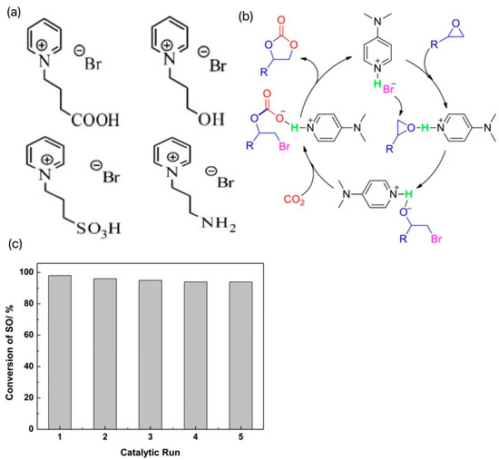 In contrast, pyridine ILs are less reported. Wang et al. synthesized a series of traditional pyridine ILs, introduced -OH, -COOH, -NH2, and -SO3H groups into the structure of 1-butylpyridine bromide ([BPy]Br), respectively, and designed four new hydrogen bond donor functionalized ILs as shown in Figure 3a. The effects of cationic properties, alkyl chain lengths, and anionic species on the catalytic activities were systematically studied by using theoretical calculation methods [20]. The results showed that the insertion reaction energy barrier of CO2 was almost negligible and did not participate in the decisive step of the reaction; the epoxide ring-opening reaction had a higher energy barrier relative to the ring-closing reaction, which showed a decisive step. Increasing the alkyl chain length can improve the catalytic activity, but the catalytic activity decreases when the alkyl chain length is increased to C4, which is attributed to the large spatial resistance of the cation that prevents the reaction from proceeding. In addition, the catalytic performances of four synthesized functionalized pyridine ILs were comparatively investigated, and the results showed that the ILs containing the carboxyl group had the highest catalytic activity for the cycloaddition reaction. The theoretical study is instructive for the further design and synthesis of functionalized pyridine ILs. Zhang et al. developed an efficient and recoverable catalyst, 4-(dimethylamino)hydrobromopyridine ([DMAPH]Br), for the generation of cyclic carbonates from atmospheric CO2 and epoxides, and the catalytic conversion mechanism is shown in Figure 3b [21]. In the presence of 1 mol % of [DMAPH]Br in solvent-free conditions, excellent conversion and selectivity were achieved for a variety of terminal epoxides. In addition, the catalyst could be recycled more than five times without a significant loss of catalytic activity, and the cycling performance was tested as in Figure 3c. The excellent catalytic performance of [DMAPH]Br was attributed to the synergistic effect of acidic protons and bromide ions on the epoxides and CO2 enhanced by the cationic positively charged off-domains. In the same period, Liu et al. developed pyridine anion-based ILs (e.g., [P4444][2-OP]) that could achieve efficient conversion of CO2 to synthesize a series of epoxides of carbonates at 30 °C and 1 MPa [22]. The high activity was attributed to the synergistic interaction of the two interaction sites in the PA-ILS anion to activate CO2 and the cation to activate the epoxide through coordination with the central P+ unit, which led to the high activity of the workhorse catalysts.
