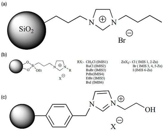 SILs are catalysts that convert carbon dioxide into various useful compounds [27]. Cyclotronic carbonates have excellent applications in different fields. Cyclotronic carbonates can be used as non-protonic solvents (polar [28,29,30], as electrolytes in lithium-ion batteries [31,32], as intermediates in reactions [33], and as monomers in polymer preparation and have practical applications in pharmaceutical sciences [34,35,36]. In this context, the researchers introduced reusable SIL Im-ILs (silica-immobilized imidazolium ILs, ILs content 1.86 mmol/g) for catalyzing the cycloaddition reaction, as shown in Figure 5a [37]. The solvent-free reaction of allyl glycerol ether (AGE) by the addition of CO2 at 1.76 MPa was successful in generating cyclic carbonates with the highest conversion (98.7%) (penta). Similar reactions were catalyzed by IMIS (silica-loaded various imidazolium ILs) with different halide anions and different alkyl chain lengths as in Figure 5b [37]. The silica-loaded 1-butyl-3-(3-triethoxysilylpropyl) imidazolium iodide showed higher AGE conversion (77.8%) and turnover (TON) (48.2%) than the other synthesized SILs under solvent-free conditions at 110 psi CO2 pressure. In addition, the researchers probed the effect of zinc halide doping of the SILs on the conversion and selectivity. Thus, the prepared IMIS-zn containing chloride anion was more active than the corresponding IMIS (without zinc) [38]. Silica-modified magnetic nanoparticles (MNPs) loaded with imidazolium ILs were also used for the cycloaddition of CO2 into styrene oxides at 1 MPa pressure [39].
