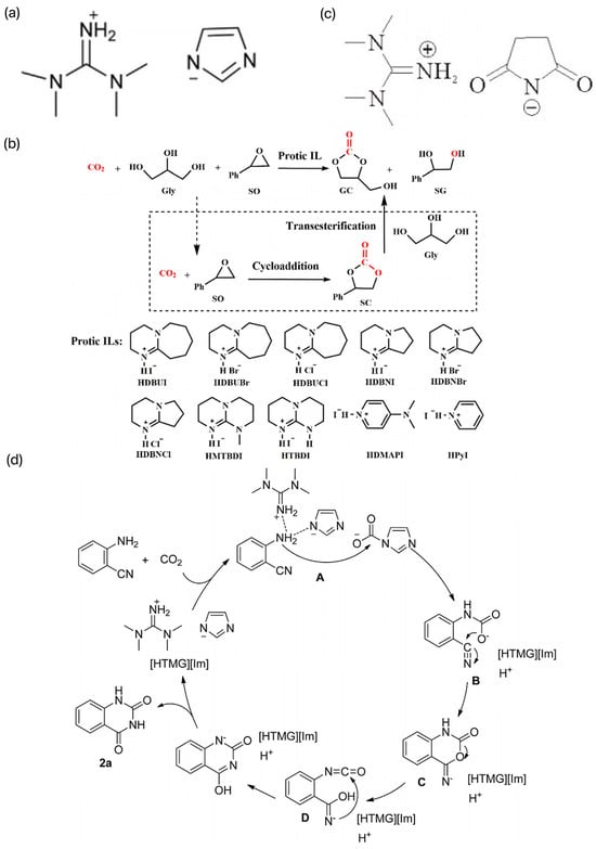 He et al. prepared a series of protonated ILs by a simple “one-step” neutralization reaction between a strong base and a weak protonated acid and investigated their applications as solvents and catalysts in the carboxylation reaction of CO2 with o-aminobenzonitrile [43]. Among them, the ILs [HTMG][Im] constructed by the neutralization reaction between TMG and imidazole had the best catalytic activity, and its structure is shown in Figure 6a. The coupling reaction of CO2 and o-aminobenzonitrile was catalyzed at room temperature and pressure without additional solvent by extending the reaction time appropriately, and the product yield could be up to 90%. A possible catalytic reaction mechanism was proposed, as shown in Figure 6b. On this basis, Liu et al. designed and synthesized several multifunctional succinimide-based ILs, the structures of which are shown in Figure 6c [44]. The ILs have the dual roles of solvent and catalyst, among which [HTMG][Suc] can reach 98% yield at 60 °C and 6 h. However, the molar amount of catalyst required is three times that of the substrate, and even if the reaction is carried out for 24 h at ambient temperature, 88% yield can be achieved. The synergistic activation of CO2 and 2-aminobenzonitrile by [HTMG][Suc] provides a reference for the reaction mechanism. In recent years, Luo et al. investigated a series of easy-to-prepare plasmonic ILs to synthesize high-value-added GCs (gas-chromatography standards) and the byproducts, benzene Z-ene glycol (SG) and styrene carbonate (SC), in a one-pot synthesis using CO2, Gly, and styrene oxide (SO) as the feedstock. The synthesis process is shown in Figure 6d [45]. SO was chosen as the substrate, and the GC yield could reach 94% at 45 °C under atmospheric pressure with 1,8-diazabicyclo[5.4.0]undec-7-iodoene (HDBUI) as the catalyst. The experimental results and density-functional theory (DFT) calculations indicated that the high catalytic activity of HDBUI was due to the strong nucleophilicity and substrate activation resulting from the synergistic interaction of the protonated HDBU+ cation and I− anion.