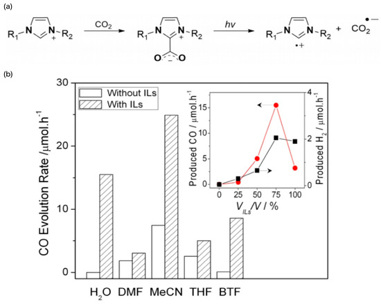 (a) Formation of imidazoliumCO2-adduct and its radical intermediates generated under irradiation [49]. (b) Promotion of CO2 photocatalysis by different ILs. The production of CO and H2 increases with the increase of the [EMIM][BF4]/H2O ratio. However, when H2O was removed, the activity of CO and H2 formation slowed down significantly [52].