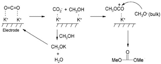 Researchers have made remarkable progress in the electrochemical reduction reaction of CO2, especially when using ILs as the reaction medium. These studies mainly focus on improving the efficiency and selectivity of the reaction. For example, Rosen et al. have made significant progress in the conversion of CO2 to CO through the method of direct electrocatalytic reduction [65]. By introducing ILs, the overpotential of CO2 reduction is successfully reduced, resulting in highly selective CO generation. The researchers further found that, by adding water to [EMIM]BF4 and using Ag as the catalytic electrode, not only can the CO2 reduction overpotential be reduced but also the CO2 conversion frequency can be increased. Cai et al. used Pt as the working electrode to prepare dimethyl carbonate by the electrocatalytic reduction of CO2 in 1-butyl-3-methylimidazole bromide (BMIMBr)-potassium methanol-methanol medium using potassium methanol as a cocatalyst [68]. The reaction mechanism is shown in Figure 8. Although this method can simplify the separation process of the product, the yield of the system is only 3.9%. When substituting propylene oxide for potassium methanol, the yield can be increased to more than 75.5%. In addition to the electrochemical conversion of CO2 to CO and HCOOH, another highly anticipated application is the conversion of CO2 to methanol, which has been extensively studied in ILs. Han and his team converted CO2 to methanol by electrochemical activation [69]. The team used a variety of bimetallic catalysts, such as Mo-Bi, Mo-Ag, and Mo-Cu, in the [BmIm][BF4]/acetonitrile solution. In 0.5 M IL-acetonitrile solution, Mo and Bi metals work together as bimetallic catalysts to achieve 71.2% Faraday efficiency for the electrochemical activation of CO2. In bimetallic MO-Bi catalysts, Mo promotes the conversion of CO2 to CO, while Bi contributes to H2 generation and in situ adsorption of CO, thus increasing the possibility of CO2 being hydrogenated to CH3OH.