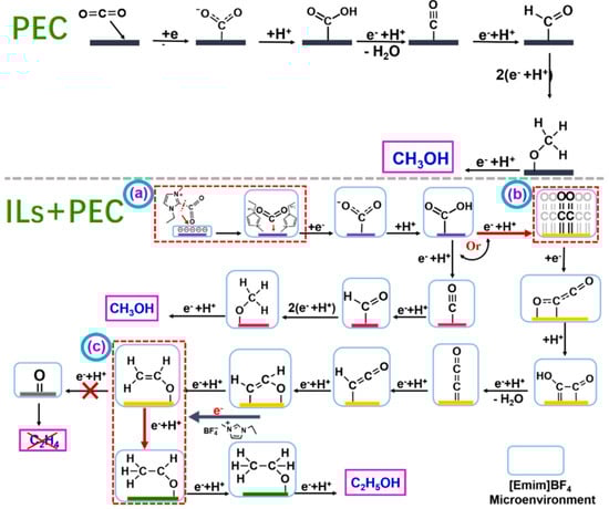Gao et al. prepared Cu2O/TiO2 nanoarray electrode materials using anodic oxidation and electrodeposition methods and applied them to the photocatalytic reduction of CO2 [55]. The mechanism of photoelectrocatalytic CO2 reduction over a Cu2O/TiO2 catalyst in the presence of [Emim]BF4 is shown in Figure 9. In the system without [Emim]BF4, CO2 molecules approach and bind to the active site on the catalyst surface to form the intermediate CO2−. This process requires overcoming a large activation energy. This intermediate is then protonated to produce HOCO, which is then converted into the key intermediate *CO through a series of electron acquisition, proton acquisition, and dehydration reactions. *CO intermediates can exist in two forms: C≡O and C=O. The former is important for the formation of C1 products, while the latter is important for the formation of C–C coupling to produce multi-carbon products. Without the addition of [Emim]BF4, the intermediate product *C≡O can be eventually converted into products such as methanol through a series of proton and electron transfer processes [74,75,76]. However, once [Emim]BF4 is added, the reaction path of the system changes significantly. [Emim]BF4 has a strong ability to capture CO2 and enrich CO2 on the catalyst surface, thus creating a high-concentration CO2 microenvironment on the electrolyte and catalyst surface. In addition, imidazole cation [Emim]+ forms [EMIM-CO2] complexes with CO2 in the catalyst–electrolyte interface region, further affecting the kinetics and reaction path of the reaction. This complex will improve the CO2 adsorption and conversion efficiency of the catalyst surface, thereby improving the selectivity and reaction rate of the final product [77]. It was found that the addition of [Emim]BF4 significantly improved the yield of the alcohol product, resulting in 82.7% selectivity for ethanol. The researchers delved into the promotion mechanism of [Emim]BF4 and concluded that the enrichment of [Emim]BF4 in the cathode region enhanced the capture of CO2. In addition, [Emim]BF4 formed a strong interaction with the electrode surface, which effectively improved the separation efficiency and migration rate of photogenerated charges.