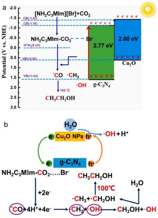 Li et al. synthesized Cu2O/g-C3N4 heterojunctions by a simple hydrothermal method to photothermally catalyze the conversion of CO2 to CH3CH2OH in an aqueous solution with the addition of the bromine salt of 1-aminopropyl-3-methylimidazole [80]. The photothermal catalytic conversion of CO2 to CH3CH2OH is shown in Figure 10a. Figure 10b shows the possible reaction pathways of Cu2O/g-C3N4 in an [APMIm][Br] aqueous solution. First, Cu2O and g-C3N4 are excited by light to generate e− and h+ ions. The transfer of e— from the CB in Cu2O to the CB in g-C3N4 promotes rapid separation of the carrier. Second, the CO2 adsorbed by Cu2O continuously complexes with [AMPIm][Br] to form APMIm-CO2, which can reduce the overpotential and react with g-C3N4 to form *CO. It has been reported that ILs provide a low-energy pathway by forming C2MIm-CO2 complexes, which can easily convert CO2 into *CO and promote continuous coupling of C–C under visible-light irradiation, which is an important reason for improving the ethanol yield [81,82,83]. In addition, continuous proton and electron transfer completed the conversion from *CO to •CH3. In addition, the thermal field can accelerate the motion and collision between •OH and •CH3, further promoting C–C coupling to generate ethanol. Finally, a series of free-radical reactions and proton–electron transfer processes are completed to achieve the conversion of CO2 to ethanol. Specifically, the consumption of *CO can reduce the coverage of *CO on the surface of Cu2O/g-C3N4, promote the reduction of CO2 to CH3CH2OH, and weaken the toxic effects of *CO. The yield of CH3CH2OH reached 0.71 mmol·g−1·h−1, which is higher than that of the pure aqueous reaction system (0.56 mmol·g−1·h−1), which was 1.27 times higher than that of the pure water reaction system (0.56 mmol·g−1·h−1). Due to the presence of amino groups in the ILs, the solubility of CO2 in the reaction system was effectively increased. In addition, the current density of the ILs electrolyte solution was 21.3 mA·cm−2, which was higher than that of the KHCO3 electrolyte solution of 12.8 mA·cm−2, and lowered the overpotential of 0.34 V, which promoted the reduction of CO2 by reducing the polarization. The ILs played a key role in inhibiting H2 generation.