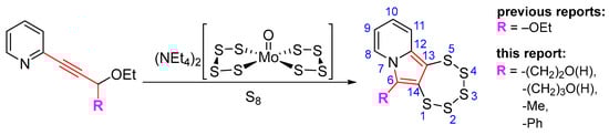 The key and, at the same time, limiting factor of this route is the employment of 2-(3,3-diethoxyprop-1-yn-1-yl)azine precursors. These are –CH(OEt)2 functionalized N-heterocyclic alkynes, which can be easily obtained by Sonogashira coupling reactions [18]. Such a synthon, upon reaction with one equivalent of elemental sulfur (cyclo-S8) and half an equivalent of bistetrasulfido(oxo)molybdate(IV) complex ((NEt4)2[MoIVO(S4)2]), leads to the formation of PTEs. The products may be distinctly substituted on the N-heterocyclic six-membered ring of the backbone. However, to date, every single one of the reported respective products from the molybdenum-mediated synthetic procedures exclusively bears an ethoxy group on the pyrrolic five-membered central ring.