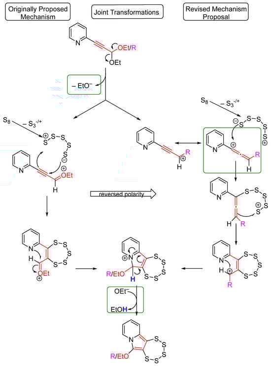 It was originally hypothesized that the first step in the molybdenum-mediated pentathiepine synthesis involves the elimination of one negatively charged OEt– group from the acetal, resulting in the formation of an ethoxonium ion (R2C=O+Et) [15] (see Figure 3 for a comparison of old and newly considered mechanistic proposals). The OEt− abstraction may be facilitated by interaction with the molybdate complex, but to date, that is not supported by any evidence. The C≡C triple bond in subsequence was proposed to react with a pentasulfido zwitterion (−S··S3··S+) generated from S8 with the help of the molybdate complex’s tetrasulfido ligands. A polarization of the triple bond was presumed due to the presence of the positively charged ethoxonium moiety. However, it appears similarly likely that the immediately formed propargylcation engages in resonance in the opposite direction, i.e., towards the alkyne moiety instead of moving the positive charge to the oxygen. Such a cation is typically stabilized via an allene resonance structure, which would reverse the polarity of the attack of the S5+/− moiety. Since the sulfur fragment to be attached is symmetrical, the outcome will be the same either way. Considering all this, the presence of an ethoxonium may not be necessary per se according to the revised hypothetical mechanism. Upon the formation of the pentathiepine ring, a rearrangement of the delocalized electrons was anticipated to facilitate the nucleophilic attack of the aza group’s nitrogen on the carbonyl moiety. This may, in fact, be an even more imminent interaction with a carbocation. Then, proton loss occurs, followed by re-aromatization of the newly formed tricyclic skeleton in either of the two mechanisms. Besides the N-heterocyclic pentathiepine, an actual ethanol molecule results from this reaction [15].