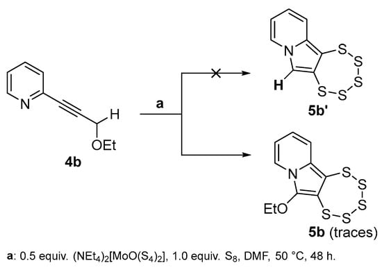 One result of the study by Zubair et al. was confirmation of the impossibility to generate a pentathiepine from an alcohol-modified precursor alkyne (propargylic alcohol) devoid of any –OEt group. We tested the analogous precursor 3a, which is a pyridine rather than a pyrazine species, as in said reference [15], under typical reaction conditions for PTE formation. As anticipated, the reaction towards the PTE, which was repeatedly carried out, did not yield any product whatsoever (Table 1). Similar results were obtained with the propyl-substituted precursor 4′a. (The prime is applied to the label since the compound does not bear an ethoxy substituent, as shown in Figure 2 above.) This confirms the previous observation that in the absence of –OEt, the reaction does not occur, and it also supports the elimination of the alcoholate anion to be an early, if not the very first, and a truly crucial step of molybdenum-mediated pentathiepine formation.