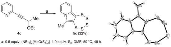 With regard to a methyl group being attached to position C-6 in the resultant PTE, the synthesis of the starting material 4c followed the same concept as for 4b. 2-Bromopyridine 1 and 3-butyn-2-ol 3c were reacted in a Sonogashira coupling reaction, followed by etherification with EtI. Remarkably, the use of compound 4c as precursor led to the formation of the first pentathiepine 5c bearing a methyl group as a new substituent, which replaces the otherwise omnipresent –OEt in position C-6 (Figure 5).