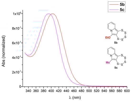 UV–vis spectrum of 5c compared to the reported spectrum of 5b (both with normalized absorbance) showing that replacing an ethoxy by a methyl substituent has only a moderate impact on the frontier orbitals (i.e., the molecule’s electronic structure).