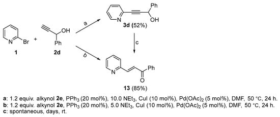 The subsequent classic Williamson-type etherification reaction [22] employing compound 2d proved challenging. Even though the product could be detected by mass spectrometry, the reaction yielded a rather complex mixture of side products. Hence, a Sonogashira cross-coupling reaction with 2-bromopyridine 1 was attempted prior to etherification rather than later to eliminate the acetylenic proton and potentially render the follow-up intermediate compound more manageable. Standard conditions were employed, utilizing DMF as solvent with PdCl2, CuI, and PPh3. Notably, a high volume of the base NEt3 (10 equiv.) turned out to be a decisive factor, as the use of lower amounts (5 equiv. or less) resulted in the formation of a side product (13, Figure 10). Likely, 13 is the result of a domino coupling–isomerization reaction, as observed previously [34]. The reported respective rearrangement was supported by the presence of Pd(II), i.e., Lewis acid-catalyzed. In consequence, a significantly higher concentration of NEt3 facilitated the formation of 3d in our case by serving as a counter Lewis and Brønsted base. Notably, 3d required swift handling and protection from light, as it spontaneously and entirely converted itself over time to 13.