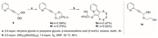 - Zubair, M.; Ghosh, A.C.; Schulzke, C. The unexpected and facile molybdenum mediated formation of tri- and tetracyclic pentathiepins from pyrazine-alkynes and sulfur. Chem. Commun. 2013, 49, 4343–4345. [Google Scholar] [CrossRef] [PubMed]