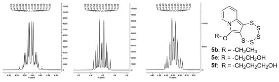 1H-NMR spectroscopic fingerprint sections for 5b (left), 5e (center), and 5f (right), showing the diastereoisotopic –CH2– pattern, which confirms PTE formation for all known species bearing an –OCH2– moiety on the pyrrolic carbon C-6. (For full spectra, see previous publication for 5b [16], Figure S31 for 5e, and Figure S33 for 5f.)