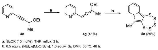 In the originally proposed reaction mechanism [15], the C≡C triple bond has two roles: (i) It will become oxidized; i.e., it is the reducing agent for the two sulfur atoms binding to the two carbon atoms and thereby becomes an inherent component of the pentathiepine unit (S–C=C–S); this is undisputedly proven by the chemical structure of the pentathiepine product. (ii) It is also part of the resonant π system of the molecule before, during, and after the transformation and helps in facilitating the formation of the N-heterocyclic 5-ring by allowing π-electron density to flow in between the N-heterocyclic 6-ring and the –CH2OEt moiety. With regard to the latter, an allene might be considered a putative intermediate resulting from a potential molecule rearrangement after OEt− abstraction if such a rearrangement takes place prior to the attachment of the S5-moiety. In order to assess this hypothesis, an allene precursor (4g) was synthesized as a derivative of 4c. Specifically in the context of indolizine derivative synthesis, a respective tautomerism in between alkyne and allene was proposed previously [45]. Various procedures for the synthesis of an allene ether from the corresponding alkyne tautomer have been reported in the literature. Methods involving the use of strong base or highly reactive BuLi [46] were tested but failed to produce the target compound. Eventually, the procedure described by Hoff et al. [47] was adapted, exposing 4c to t-BuOK in dry THF, which efficiently yielded 4g.