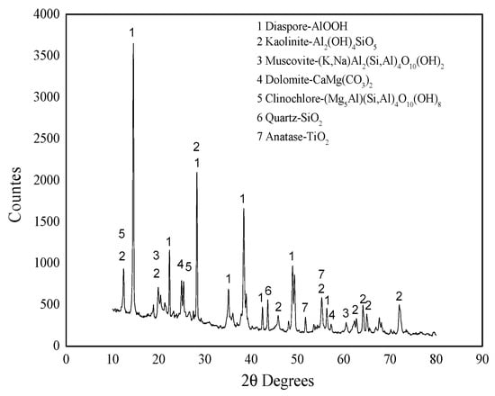 The ARL Peform’X wavelength-dispersive X-ray fluorescence spectrometer produced by Thermo Fisher Scientific (Waltham, MA, USA) was used to analyze the chemical composition of bauxite before and after calcination. During the test, 4.0 g of samples was accurately weighed (dried and sieved through a 200 mesh) and placed into a mold. The bottom was filled with boric acid powder, pressurized at 40 T, and held for 30 s to create a disk with a sample diameter of 29 mm. It was then placed in the corresponding sample cup of the instrument, and UniQuant semi-quantitative software (https://assets.thermofisher.cn/TFS-Assets%2FMSD%2FSpecification-Sheets%2FXR-PS41207-UniQuant.pdf) was used for analysis in a vacuum environment. The gas used by the detector was P10 gas (10% methane and 90% argon), and the analysis was run under the following conditions: power ≥ 4.2 kW, voltage ≥ 60 kV, current ≥ 120 mA, and Be window thickness of 75 m. The target material used for the test was a rhodium target, and the crystals used for the analysis were LiF200 (60 kV, 40 mA), LiF220 (60 kV, 40 mA), Ge111 (40 kV, 60 mA), and AX03 (30 kV, 80 mA).