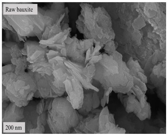 Table 1 shows that the main component of the bauxite raw material is Al2O3, with a content of 60.39%, offering appropriate application potential. Figure 1 and Figure 2 indicate that the main component of the bauxite raw material is diaspore (AlO(OH)), and the bauxite raw material shows a well-defined layered structure according to SEM.