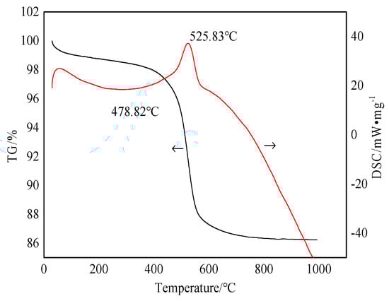 The VERTEX 70 Fourier Infrared Spectrometer from BRUKER (Karlsruhe, Germany) was used to analyze the relationship between the temperature and the gas release products of the sample before and after calcination. A small amount of sample (about 0.6 mg) and a certain amount of potassium bromide (about 200 mg) were placed in an agate mortar for uniform grinding and tableting. A wavenumber range of 4000 to 400 cm−1 was selected to perform the FT-IR test on the sample.