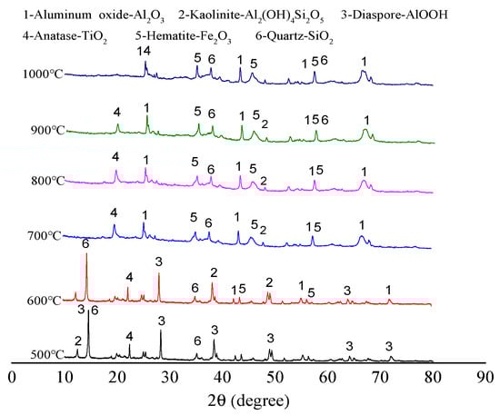 According to the preliminary exploration test, the test conditions were determined: raw bauxite was crushed to 200 mesh. To ensure uniform sample heating, 10 g of sample was taken each time and placed into a ceramic crucible. The ceramic fiber furnace model TC-2.5-12 was heated at a step of 10 °C/min at room temperature. The ceramic crucible containing the sample was calcined for 10 min when the temperature reached 500 °C, 600 °C, 700 °C, 800 °C, 900 °C, and 1000 °C. After the calcination ended, the sample was taken out of the ceramic fiber furnace and placed in a drying dish to cool until room temperature.