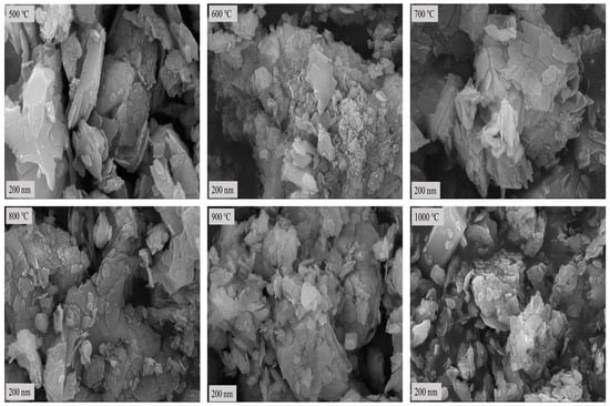 After calcination at low temperature, SEM was used to observe the bauxite microtopography after calcination at 500 °C, 600 °C, 700 °C, 800 °C, 900 °C, and 1000 °C for 10 min for comparative analysis. Diaspore, the main component of the raw ore, gradually converts to corundum after low-temperature calcination. Therefore, the bauxite morphology changes significantly before and after low-temperature calcination. Figure 5 shows the SEM topography of bauxite after calcination at various temperatures.