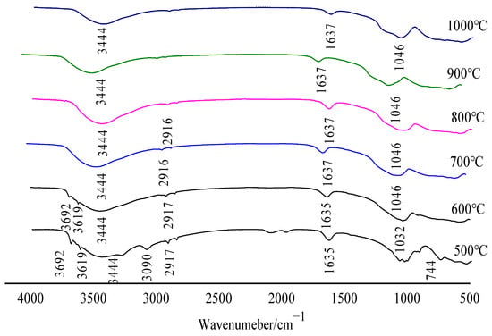 The VERTEX 70 Fourier Infrared Spectrometer from BRUKER (Rheinstetten, Germany) was used to analyze the relationship between the temperature and the gas release products of the sample before and after calcination. As shown in Figure 6, the infrared spectrum of gas release products during oxidative clinker roasting when bauxite was calcined at various temperatures includes three groups: O–H, C–O, and Si–O–T (T = Al, Fe, or Si).