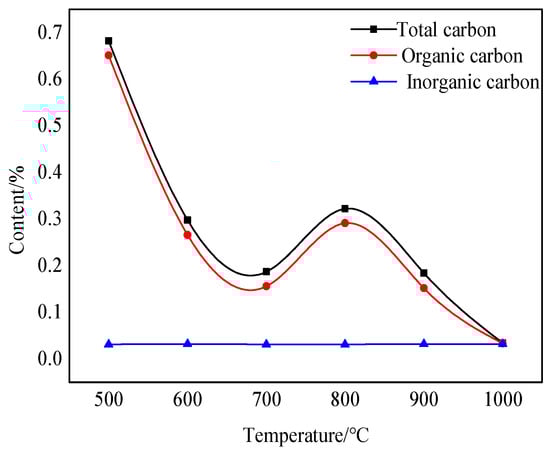 Carbon in nature mainly exists in two forms: organic and inorganic. Although bauxite has a relatively low carbon content, changes in its content also affect the color change after calcination at various temperatures. Figure 7 shows changes in the total carbon and organic carbon content after calcination at various temperatures.