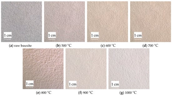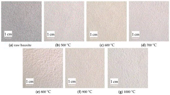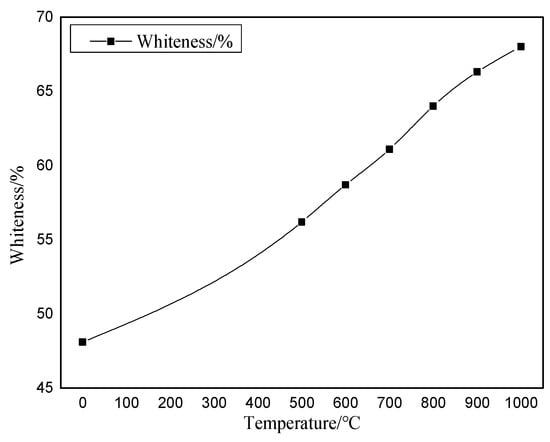 After the bauxite is calcined at various temperatures for 10 min, the macroscopic appearance of the color change is the change in whiteness. Using the WSB-X digital whiteness meter from Sichuan Sichuang Beike Technology Co., Ltd. (Suining, China), the sample whiteness is observed after calcination at various temperatures. The whiteness variation range is shown in Figure 8. The original color image after calcination at various temperatures is shown in Figure 9.
