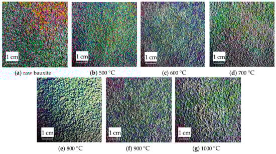 As shown in Figure 8 and Figure 9, bauxite exhibits noticeable changes in color characteristics after calcination at various temperatures for 10 min. As the calcination temperature rises from 500 °C to 1000 °C, the whiteness of the clinker rises from 56.2% to 68%. This indicates that the bauxite color change after calcination is a gradual whitening process.