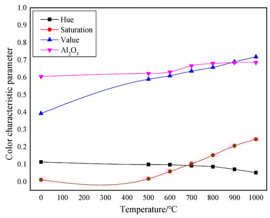 The HSV conversion diagram reflects the intuitiveness of colors [21], which coincides with the human visual perceived color. Figure 12 shows the HSV conversion diagram. The observation indicates that the bauxite raw material image is basically red [22]. Increasing the calcination temperature will gradually reduce the red areas in the image. This trend is consistent with the whiteness variation. As shown in Figure 13, the color characteristic value parameters of bauxite show a relatively obvious variation under various calcination temperatures. Under a calcination time of 10 min, when the temperature rises from 500 °C to 1000 °C, the brightness characteristic value that the human eye recognizes as the brightness of a light source or an object and the saturation characteristic value that indicates color purity tend to increase noticeably. The chromaticity characteristic value that reflects color characteristics is on a downward trend. The trend of the change in Al2O3 content after calcination at various temperatures is consistent with the changing trend in the brightness and saturation.
