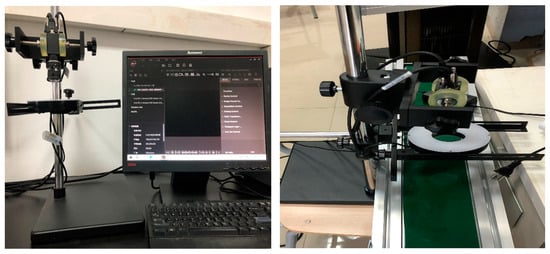 The image acquisition system used in this paper is composed of an MV-CA050-10GC industrial camera (5 MP, COMS sensor) produced by Hikvision (Hangzhou, China), a Lenovo Y7000p computer, and an auxiliary light source. In order to reduce the error caused by environmental factors, the machine vision system was set up with an independent ring light source system and configured with a digital light control system and a light shield to isolate the test system from external light sources. At the same time, a filter lens was set on the lens, and dust cleaning was carried out with special tools after each test. After collecting bauxite images calcined at different temperatures, the images were first grayed out and median-filtered to denoise. The image RGB color space was converted to HSV space and finally processed by MATLAB 2019, a software package used to extract image color feature parameters (chromaticity, brightness, saturation) [23]. The image acquisition system is shown in Figure 14.
