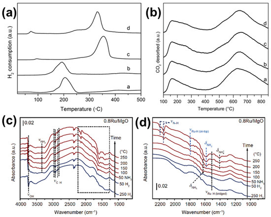 (a) TPR profiles of Ru/MgO catalysts: a 3%Ru/MgO-IM; b 5%Ru/MgO-IM; c 3%Ru/MgO-DP; d 5%Ru/MgO-DP [48]. (b) CO2-TPD spectra of reduced a 5%Ru/MgO-DP, b 1%Ru/c-MgO-DP, c 3%Ru/c-MgO-DP, and d 5%Ru/c-MgO-DP [49]. (c) In situ DRIFTS study of NH3 adsorption on 0.8Ru/MgO during the heating process; (d) the partial enlarged detail of (c) in the dashed box (color online) [64].