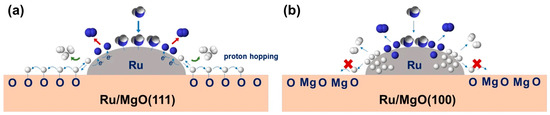 Mechanism illustration of ammonia decomposition on Ru/MgO(111) and Ru/MgO(100). The different behaviors of hydrogen hopping in (a) Ru/MgO(111) and (b) Ru/MgO(100) [50].