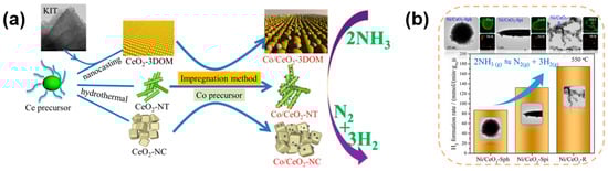 (a) Schematic diagram to illustrate the CeO2 with different morphology-supported Co catalysts for ammonia decomposition to hydrogen [52]. (b) Three different morphologies of CeO2 as a carrier for Ni/CeO2 catalysts and the corresponding catalytic properties for ammonia decomposition [54].