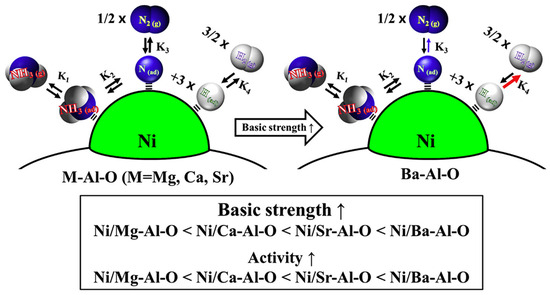 Ji et al. [77] also used LDH as precursors to regulate the surface basicity of the catalyst carriers as well as the particle size of Ni at the catalytic sites by adjusting the ratios of Ni/Mg and Mg/Al. When the ratio of Mg/Ni was adjusted, there were more basic sites of the catalyst with the increase in the Mg element; meanwhile, according to the results of H2-TPR, the higher the percentage of the Mg element, the higher the reduction temperature of the catalyst. This suggests that the increase in the number of electrons on the surface of the catalyst through the doping of Mg improves the electron transfer from the carrier surface to the active metal center, thus improving the stability of the catalyst. During the process of ammonia decomposition, Ni0.12Mg1.09Al0.3On has the largest hydrogen–hydrogen transition frequency (TOF) of 8.1 s−1. Therefore, by adjusting the surface acidity and alkalinity of the carrier catalysts as well as the interactions between the carriers and the catalyst particles, it helps to improve the performance of ammonia decomposition. Eguchi et al. [78] modulated the surface basic density of the Al2O3 carrier by individually doping different alkaline earth metals (Mg, Ca, Sr, or Ba) into Al2O3. The difference in basicity between the different alkaline earth metals resulted in different surface basic densities of the Al2O3 carriers, and consequently, there was a difference in the performance of the catalysts, as shown in Figure 6. The CO2-TPD test of the alkaline earth metal-modified catalyst (Ni/AM-Al-O) revealed that Ni/Ba-Al-O contained a high number of strongly basic sites. Therefore, during the ammonia decomposition test, Ni/Ba-Al-O embodied the best catalytic performance with a conversion rate of 90.3% at 550 °C under 6000 mL gcat−1 h−1. Zhang [79], Wang [39], and Chae [80] et al. also modified the surface acidity and alkalinity of the oxide carriers by elemental doping, and the performance of the catalysts was significantly enhanced, effectively improving the performance of ammonia decomposition.