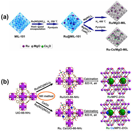 (a) Schematic synthetic protocols of MIL-101-confined Ru clusters [92]. (b) Schematic illustration for preparing Ru and Ru/Cs catalysts on mesoporous zirconia using a combination of incipient wetness impregnation (IWI) and calcination approach [74].