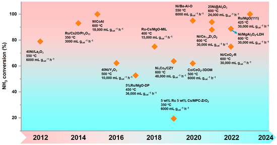 Over the past decade, a large amount of research work has revolved around the use of monometallic oxides as carriers for loading metal nanoparticles as catalysts to improve the performance of ammonia decomposition, such as Al2O3 [42,43,44,45,46,47], MgO [48,49,50] and rare-earth metal oxides such as CeO2 [51,52,53,54,55,56,57,58], Pr2O3 [59], Sm2O3 [60] and La2O3 [61].