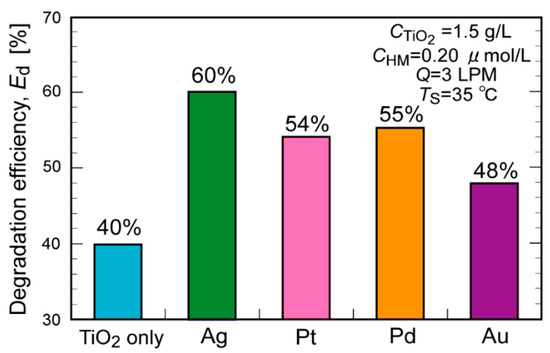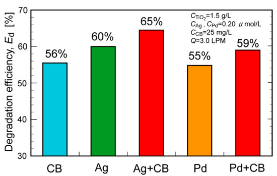 Figure 1 shows the toluene degradation efficiency, Ed, obtained in the absence (denoted as TiO2 only) and presence of heavy metal NPs (denoted as Ag, Pt, Pd, and Au). The addition of a very small amount of metal NPs enhanced the Ed from 40% to 48–60%. The Ed values increased in the following order: Ag > Pd > Pt > Au > TiO2 only. Next, CB was added to the TiO2 suspension (denoted as CB) or the Ag- or Pd NP-containing suspension (denoted as Ag+CB and Pd+CB, respectively). In all cases, the addition of CB increased the Ed by approximately 5% (from 40%, 60%, and 55% to 56%, 65%, and 59%, respectively; Figure 2). The addition of both heavy metal NPs and CB effectively improved the Ed. The lower effectiveness of metal NPs in the co-presence of CB compared (approximately 5% increase) might be due to the lower toluene concentration at the high-level conversion region and resulting lower mass transfer. The XRD measurements of TiO2 (as received) before and after the addition of Ag NPs and under UV irradiation or not were performed. In all cases, only the XRD pattern derived from anatase and rutile was observed (Figure S1).