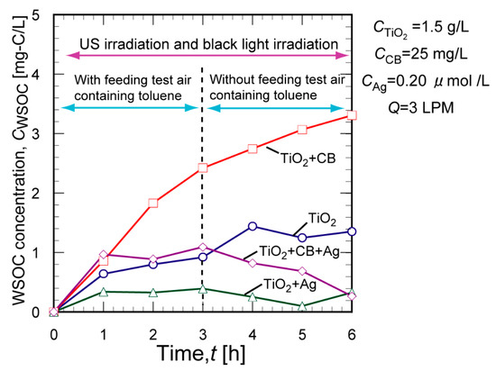 Change in the WSOC concentration in the TiO2 suspension with and without additives (CB or Ag).