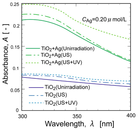 To investigate the adsorption properties of the series of TiO2 suspensions, UV-vis measurements were performed. Figure 5 shows the UV-vis spectra for a series of TiO2 suspensions, including one containing Ag NPs, after US and UV irradiation. Regardless of the presence or absence of Ag NPs, US irradiation induced an increase in absorbance in the UV-vis spectra owing to the enhancement of dispersiveness. UV irradiation further increased the absorbance, especially for the TiO2 suspension containing Ag NPs (TiO2+Ag), indicating that the oxidized surface of the Ag NPs was photoreduced by UV irradiation [25]. The UV-vis spectra of the TiO2 suspensions are shown in Figure S2. The addition of heavy metal NPs resulted in enhanced absorbance in the UV-vis spectra. The absorbance at 360 nm increased in the following order: Ag > Pd > Au > Pt > TiO2. This order is slightly different from that of the Ed (Ag > Pd > Pt > Au > TiO2).