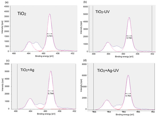 We also performed X-ray photoelectron spectroscopy (XPS) measurements to study the surface chemical states of TiO2 before and after UV irradiation. Figure 6a–d show the XPS spectra for the Ti 2p region for a series of TiO2 samples. The spectra for the O 1s are also shown in Figure S3. All the XPS spectra exhibited peaks at approximately 464 and 458 eV assignable to the Ti 2p1/2 and 2p3/2 states, respectively, which are derived from the Ti4+ species on TiO2. For TiO2 without metal NPs, the peak position and full width at half maximum (WFHM) values for Ti 2p2/3 were nearly the same, regardless of the presence or absence of UV irradiation (0.741 and 0.740 eV for TiO2 and TiO2-UV, respectively, Figure 7). In the case of the Ag NP-containing TiO2, the WFHM value increased from 0.744 to 0.763 eV upon UV irradiation, indicating that the Ti 2p3/2 peak broadened. Ag NPs capture electrons generated from TiO2 by UV irradiation and inhibit the recombination of electrons and holes [26]. In addition, previous reports have found that the Ti 2p3/2 peaks were broadened in the XPS spectra of Ag-loaded TiO2 prepared by photoreduction because some of the surface Ti4+ species were reduced to Ti3+ by trapped electrons [25]. In our case, the added Ag NPs were immobilized on the TiO2 surface, promoting the reduction in the surface Ti4+ species in a similar manner.