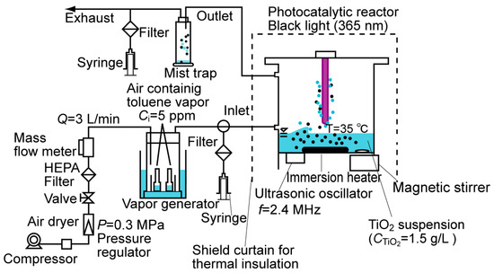 The experimental setup for the degradation of toluene (as a model VOC) using ultrasonically generated mists containing TiO2 is shown in (Figure 10). The experimental reactor, which consisted of poly(methyl methacrylate) resin (Figure S6), was equipped with an ultrasonic transducer (Honda Electronics, Toyohashi, Japan, HM-303N). Ultrasonically generated mists containing TiO2 were generated inside the reactor when a TiO2 suspension in deionized water was irradiated with 2.4 MHz ultrasound waves. Degussa P-25 TiO2 (Nippon Aerosil, Tokyo, Japan) was used in all the experiments because the P-25 TiO2 particles can generate a sufficient amount of OH radicals in the liquid phase [28]. The crystal structure of the P-25 TiO2 particles was approximately 80% anatase and 20% rutile, and the average particle diameter was approximately 30 nm. The submicrometer-sized aggregation of TiO2 was observed by scanning electron microscopy (SEM) (Figure S7). The surface area of TiO2, as measured with a BET surface analyzer (Micromeritics, Norcross, GA, USA, Flowsorb III-2305), was 50 m2g−1. The TiO2 concentration was fixed at 1.5 g L−1. A black light blue (BLB) lamp with a maximum light intensity output of 365 nm (UV365; Sankyo Denki, Hiratsuka, Japan, FL4BLB) was used as the light source. Detailed emission spectra of the lamps are presented elsewhere [19]. The observed relative humidity was over 95%, which was outside of the measurement range for all conditions, indicating that the mist in the reactor could be maintained under stable conditions.