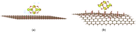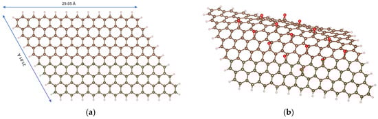 A graphene model is constructed as a flat carbon layer containing 214 atoms, where the boundary carbon atoms are saturated with hydrogen atoms, corresponding to the formula C214H40 (Figure 1a). The mass fraction of carbon in this model is 98.5%, consistent with experimental analyses of the chemical composition of GP [18,19]. It should be noted that, in reality, oxygen always constitutes a small proportion of the chemical composition of GP. However, for ideal modeling purposes, we employ a completely oxygen-free GP model.