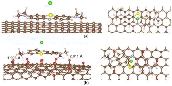 Optimized adsorption configurations of MB on GP (a) and rGO (b); color codes: brown—C; ivory—H, yellow—Ce; red—O; green—Cl; gray—N; light yellow—S.