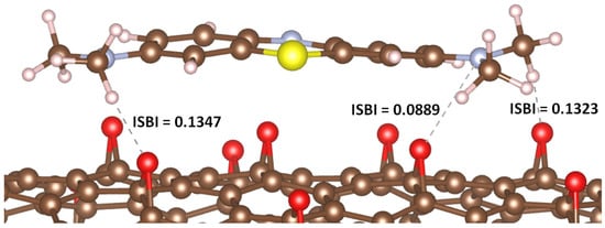 The results obtained are intriguing. In the case of MB adsorption on GP, no significant IBSI value was observed between the MB atoms and the carbon atoms on the GP surface. Conversely, when adsorbed onto rGO, the hydrogen and nitrogen atoms of MB interacted with the oxygen atoms in the epoxide groups of rGO, yielding relatively high IBSI values (see Figure 3).