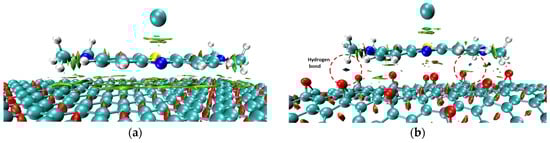In the case of MB/GP, the RDG graph (Figure 4a) shows spikes in the range of sign (λ2) ρ values from −0.01 to 0.015 a.u, corresponding to vdW interactions between the MB molecule and the GP surface (colored in green in Figure 5a). Due to the flat structure of the GP surface, the vdW interactions and other weak interactions, such as π-π stacking, between MB and GP are more pronounced than on the curved surface of rGO. However, when interacting with rGO, in addition to vdW interactions similar to those with GP, there are also regions indicating hydrogen bond formation (colored in blue in Figure 5b). Additionally, the interaction between the N-H groups of MB and the oxygen atoms of rGO through hydrogen bonds or electrostatic interactions aligns well with the findings of Manash et al. [15]. Consequently, calculations of adsorption energy, along with structural parameter and population analysis, demonstrate that the adsorption of MB on rGO is more favorable than on GP.